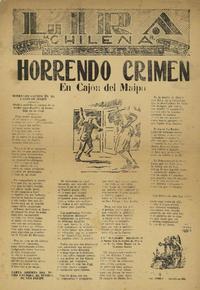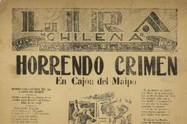 Horrendo crimen en Cajón del Maipo. [Santiago, Chile] : [Editor no identificado], [1950?] ([Santiago] : Imprenta Varela) 1 hoja : ilustraciones ; 38 x 27 cm. .