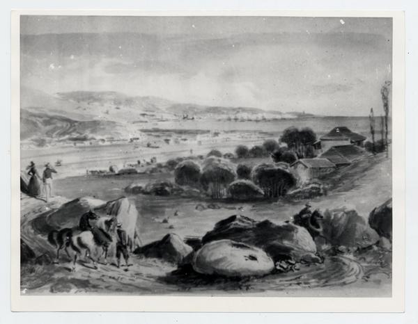 [Valparaíso, sector costero, caminos de tierra, además se divisan unas casas y unos hombres con caballos] [fotografía].