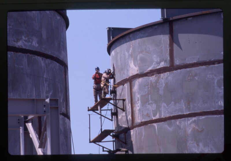 [Trabajadores junto a una estructura hidráulica, antes de su instalación] [fotografía].