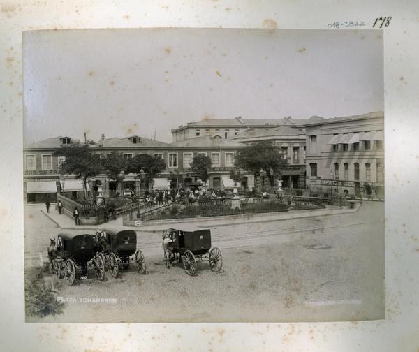 [Plaza Echaurren, con carruajes al costado de la plaza en Valparaíso] [fotografía] Fotografía Leblanc.