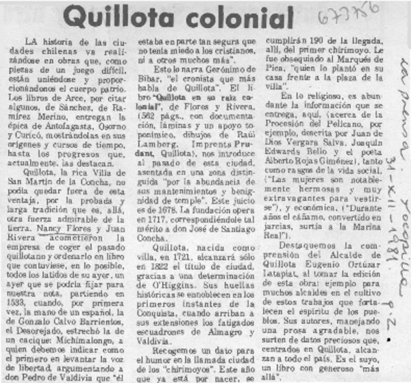 Autores chilenos - Flores, Nancy - Quillota en su raíz colonial - Rivera, Juan
