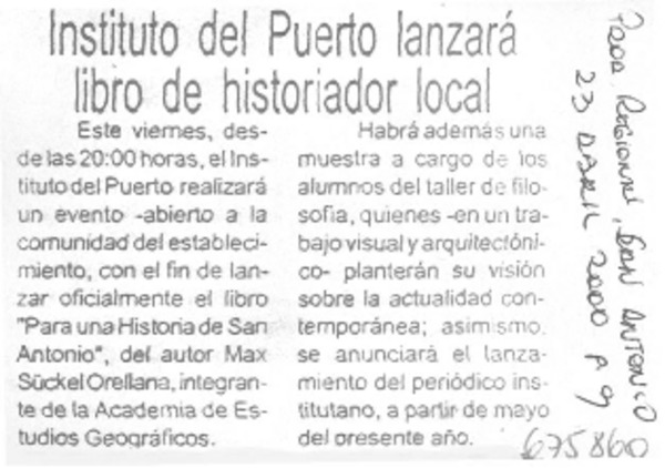 Instituto del Puerto lanzará libro de historiador local. [artículo]