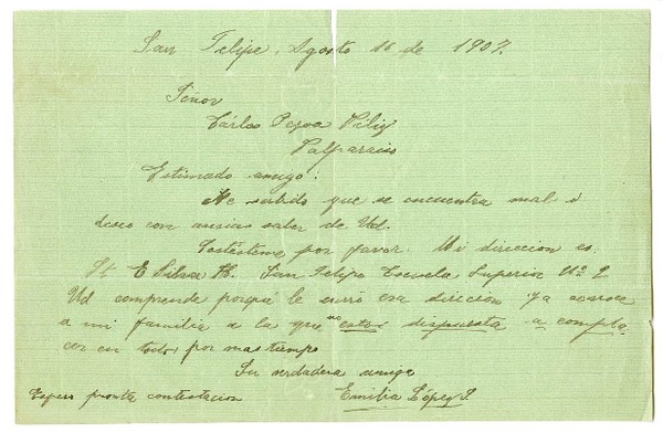 [Carta] 1907 agosto 16, San Felipe, Chile [a] Carlos Pezoa Véliz. [manuscrito] Emilia López.