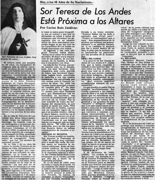 Sor Teresa de Los Andes está próxima a los altares [artículo] Carlos Ruiz Zaldívar.