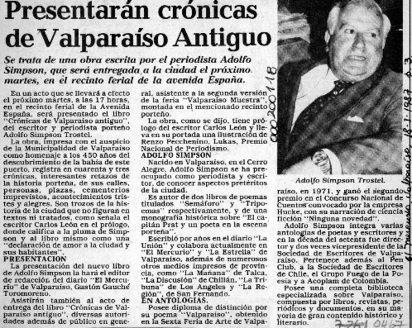 Presentarán crónicas de Valparaíso antiguo [artículo].