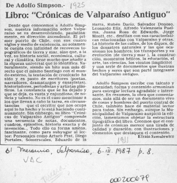 Libro, "Crónicas de Valparaíso antiguo" [artículo] Efraín Szmulewicz.