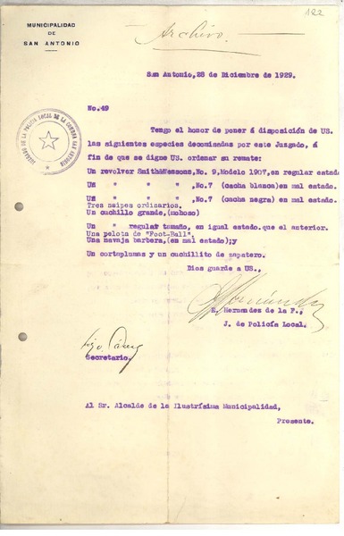 [Carta] 1929 dic. 28, San Antonio, Chile [al] [Alcalde Municipal] [manuscrito] E. Hernández de la F. y Luis Omar Cáceres.
