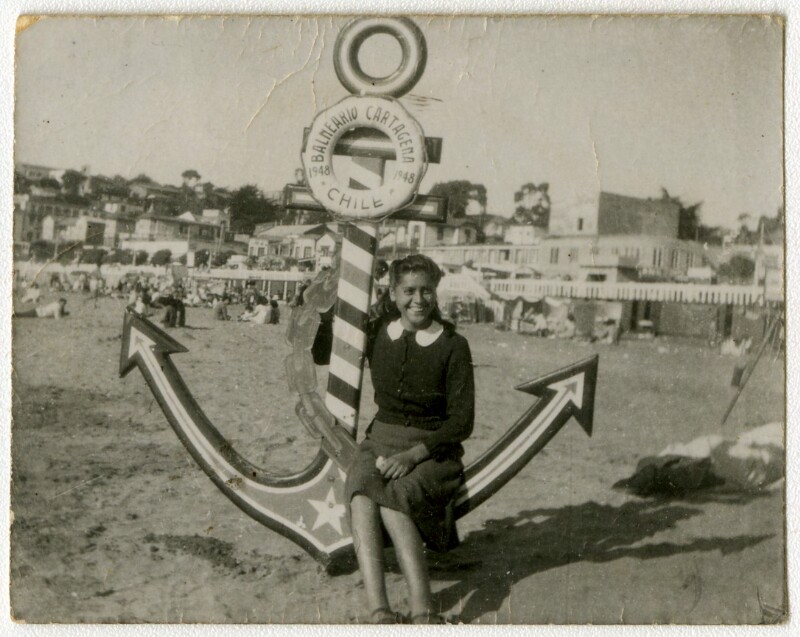 [Muchacha sentada en una (imitación) de ancla en balneario de Cartagena] [fotografía].