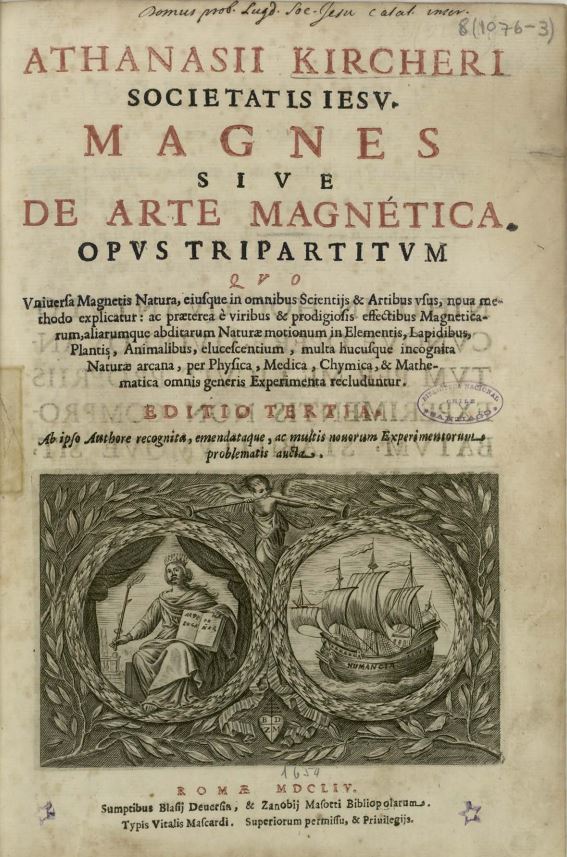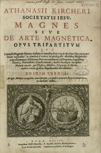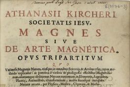 Magnes sive de arte magnetica : opus tripartitum quo universa magnetis natura, eiusque in omnibus scientijs & artibus usus, nova methodo explicatur : ac præterea é viribus & prodigiosis effectibus magneticarum, aliarumque abditarum naturæ ... / Athanasii Kircheri. Romæ : Sumptibus Blasij Deversia & Zanobij Biblipolarum, 1654. [30], 618, [29] páginas : ilustraciones ; 33 cm .