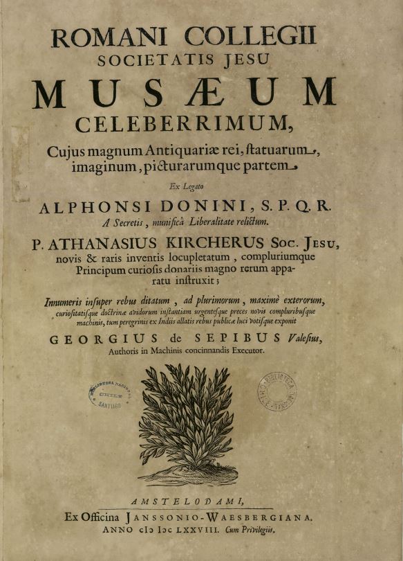 Romani collegii societatis jesu musæum celeverrimum, cujus magnum antiquariæ rei, statuorum, imaginum, picturarumque partem / P. Athanasius Kircherus ; Georgius de Sepibus Valesius authoris in Machinis concinnandis executor. Amstelodami [Amsterdam] : Ex officina Jassonio-Wæsbergiana, 1678. [4], 66, [6] páginas 8 hojas de láminass, 8 hojas de láminas plegable, 1 hoja plegable : ilustraciones ; 40 cm. .