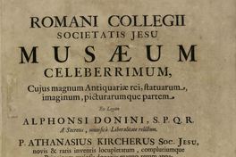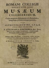 Romani collegii societatis jesu musæum celeverrimum, cujus magnum antiquariæ rei, statuorum, imaginum, picturarumque partem P. Athanasius Kircherus ; Georgius de Sepibus Valesius authoris in Machinis concinnandis executor.