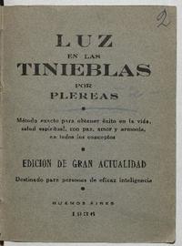 Luz en las tinieblas : método exacto para obtener éxito en la vida, salud espiritual, con paz, amor y armonía, en todos los conceptos por Plereas. Buenos Aires : [s.n.], 1936. 46 p. , 15 cm. .