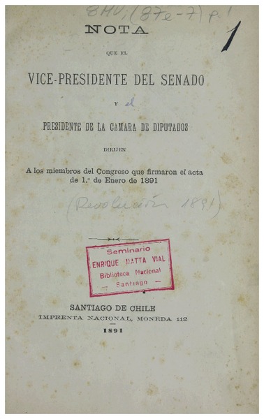 Nota que el vice presidente del Senado y el presidente de la Cámara de Diputados dirigen a los miembros del Congreso que firmaron el acta de 1o. de Enero de 1891 Ramón Barros Luco.