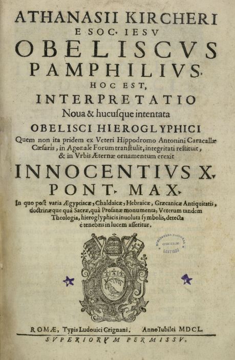 Obeliscus pamphilius, hoc est, interpretatio noua & hucusque intentata obelisci hieroglyphici : quem non ita pridem ex veteri hippodromo Antonini Caracallæ cæsaris, in Agonale Forum transtulit, integritati restituit & in urbis æternæ ornamentum erexit Athanasii Kircheri.