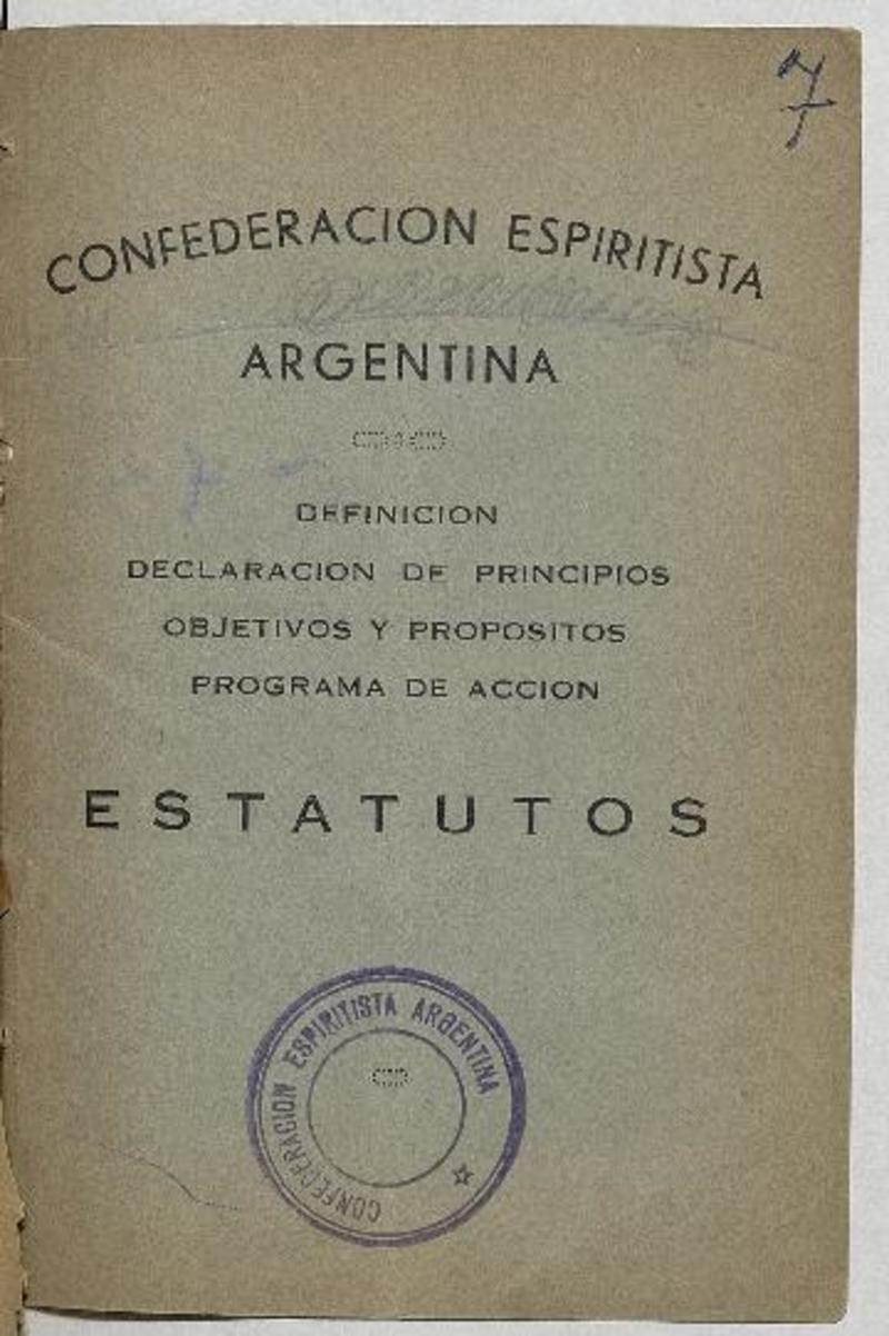 Definición, declaración de principios, objetivos y propósitos, programa de acción : estatutos aprobados por el Segundo Congreso Espiritista Argentino Confederación Espiritista Argentina.