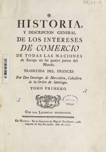 Historia y descripcion general de los intereses de comercio de todas las naciones de Europa en las quatro partes del mundo traducida del frances por Don Domingo de Marcoleta.