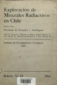 Exploración de minerales radioactivos en Chile / Paul H. Knowles... [et al]. Santiago, Chile : Instituto de Investigaciones Geológicas, 1964-1966 (Santiago de Chile : Editorial Universitaria) 2 volúmenes ; 23 cm. .
