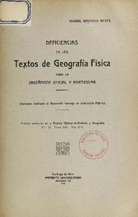 Deficiencias en los textos de geografía física para la enseñanza oficial y particular : opúsculo dedicado al Honorable Consejo de Instrucción Pública / Ismael Gajardo Reyes. Santiago de Chile : Imprenta Universitaria, 1916 14 páginas ; 24 cm .