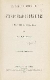 El oidium tuckeri : enfermedad de las viñas i medios de curarla / por René F. Le-Feuvre. Santiago : Imprenta Nacional, 1877. 24 paginas , [1] hojas de láminas : ilustraciones ; 24 cm. .