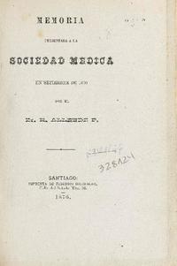 Memoria presentada a la Sociedad Médica en Septiembre de 1876 / por el Dr. R. Allende P. Santiago: Imprenta de Federico Schrebler, 1876 10 páginas ; 22 cm. .