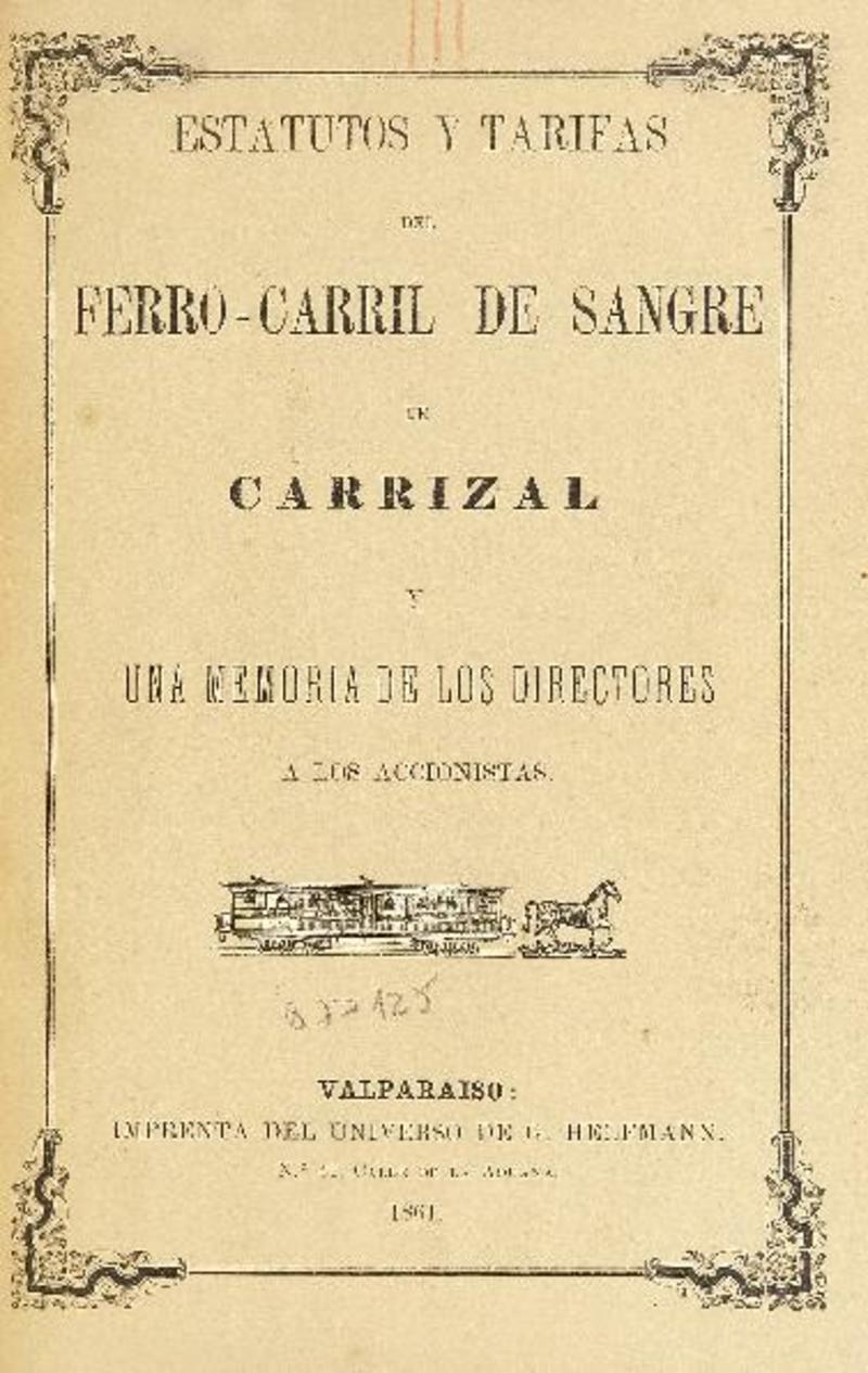 Estatutos y Tarifas y una memoria de los directores a los accionistas / Ferro-Carril de Sangre de Carrizal Valparaíso : Imprenta del Universo de G. Helfmann, 1861. 30 páginas ; 23 cm. .