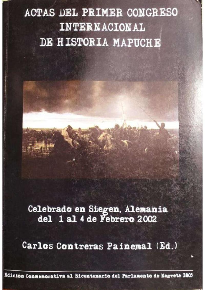 Actas del primer Congreso Internacional de Historia Mapuche : celebrado en Siegen, Alemania del 1 al 4 de febrero 2002 / Carlos Contreras Painemal, (editor). Siegen : Eigenverlag, 2003. 200 páginas : ilustraciones ; 30 cm. .