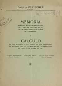 Memoria sobre la situación financiera de la Caja de Previsión Social de los Empleados Municipales de Valparaíso y cálculo de los recursos y del costo de los beneficios de acuerdo con los establecido en los estatutos de fecha 26 de marzo de 1929. Valparaíso : [s.n.], 1967 (Valparaíso : Impr. Victoria) v. ; 26 cm. .