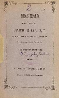 Memorias leida ante el consejo de la V. O. T. de Ntra. Stma. Madre de la Merced / por el secretario en sesión del 6 de octubre del presente año V. Gonzalez Pastene. Valparaíso : Imprenta de Chile de A. Monticelli, 1867. 16 páginas ; 20 cm. .