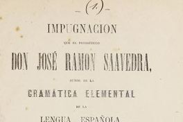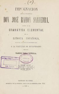 Impugnación que el Pbro. Don José Ramon Saavedra, autor de la Gramática elemental de la lengua española, hace del informe pasado sobre ella a la facultad de humanidades por Don Francisco Vargas Fontecilla. Santiago : Imprenta de La Opinión, 1860. 65 páginas ; 20 cm. .