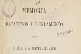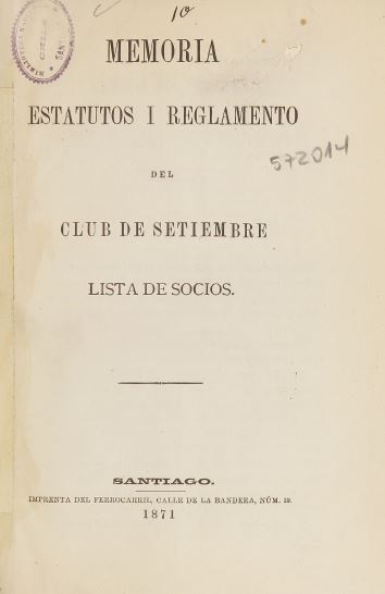 Memoria, estatutos i reglamento / del Club de setiembre. Santiago : Impr. del Ferrocarril, 1871. 32 p. ; 22 cm. .
