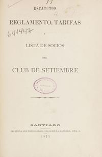 Estatutos, reglamento, tarifas i lista de socios / del Club de Setiembre. Santiago : Imprenta del Ferrocarril, 1871. 36 páginas ; 22 cm. .