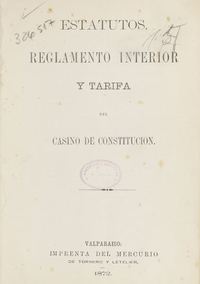 Estatutos, reglamento interno y tarifa / del Casino de Constitución. Valparaíso : Impr. del Mercurio de Tornero y Letelier, 1872. 15 p. ; 22 cm. .