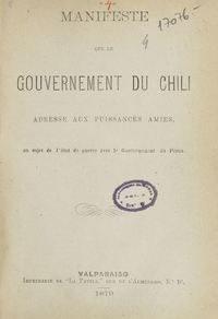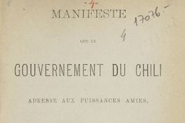 Manifeste que le Gouvernement du Chile adresse aux puissances amies, au sujet de l''etat de guerre avec le Gouvernement du P'erou / Alejandro Fierro. Valparaíso : Imprenta La Patria, 1879. 15 páginas ; 22 cm. .
