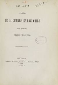 Una carta a propósito de la guerra entre Chile i las Repúblicas del Perú i Bolivia. Santiago : Imprenta Nacional, 1880. 38 páginas ; 20 cm. .