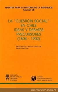 La cuestión social en Chile : ideas y debates precursores : (1804-1902) / recopilación y estudio crítico de Sergio Grez Toso. Santiago de Chile : DIBAM, 1997. 577 páginas : ilustraciones ; 23 cm. .