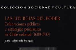 Las liturgias del poder : celebraciones públicas y estrategias persuasivas en Chile colonial (1609-1709) / Jaime Valenzuela Márquez ; prólogo de Bernard Lavallé. Santiago, Chile : Centro de Investigaciones Diego Barros Arana, DIBAM, 2001. Santiago, Chile : Lom Ediciones, 2001. 499 páginas : ilustraciones ; 23 cm. .
