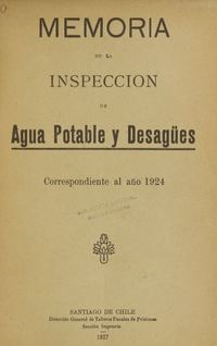 Memoria de la inspección de agua potable y desagües : correspondiente al año 1924. Santiago de Chile : Dirección General de Talleres Fiscales de Prisiones, Sección Imprenta, 1927. 127 páginas, 14 hojas de láminas sin numerar : diagramas ; 24 cm. .