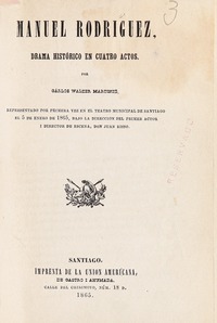 Manuel Rodríguez : drama histórico en cuatro actos / por Carlos Walker Martínez representado por primera vez en el Teatro Municipal de Santiago el 5 de enero de 1865, bajo la dirección del primer actor i director de escena, don Juan Risso". Santiago : Imprenta de la Unión Americana, 1865. 86 páginas ; 24 cm. .