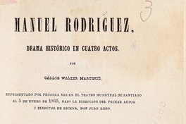 Manuel Rodríguez : drama histórico en cuatro actos por Carlos Walker Martínez representado por primera vez en el Teatro Municipal de Santiago el 5 de enero de 1865, bajo la dirección del primer actor i director de escena, don Juan Risso".