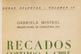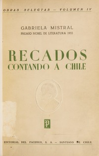 Recados : contando a Chile / Gabriela Mistral ; selección, prólogo y notas de Alfonso M. Escudero. Santiago, [Chile] : Del Pacífico, 1957. c1957 269 páginas ; 18 cm. .
