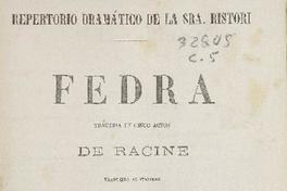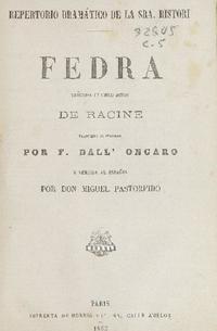 Fedra : tragedia en cinco actos / de Racine ; traducida al italiano por F. Dall' Ongaro y vertida al español por Miguel Pastorfido. Paris : Imprenta de Morris y Ca., 1863. 28 p. ; 25 cm. .