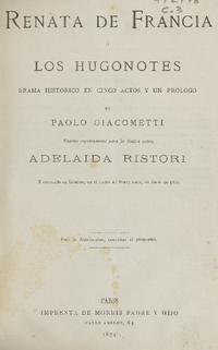 Renata de Francia, ó, Los Hugonotes : drama en cinco actos y un prólogo / de Paolo Giacometti. Paris : Imprenta de Morris Padre e Hijo, 1874. 72 p. ; 24 cm. .