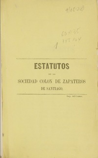Estatutos / de la Sociedad Colón de Zapateros de Santiago. Santiago : La Sociedad, 1873 (Santiago : Imprenta del Correo) 16 p. ; 22 cm. .