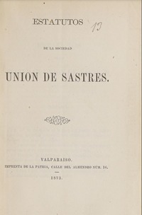 Estatutos de la Sociedad Unión de Sastres de Valparaíso. Valparaíso : [Carrasco y Jímenez, Impresores] , 1900. 30 páginas ; 17 cm. .