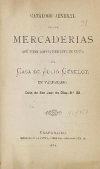 Catálogo jeneral de las mercaderías que tiene constantemente en venta : la casa de Julio Gévelat en Valparaíso, calle de San Juan de Dios, nº 181. Valparaíso : Imprenta La Patria, 1874. 15 páginas ; 22 cm. .