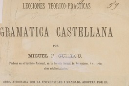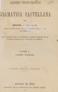 Lecciones teórico-prácticas de gramámatica castellana / por Miguel F. Guillou. Santiago de Chile : Imprenta de La República de Jacinto Núñez, 1876 2 volumens en un tomo ; 19 cm .