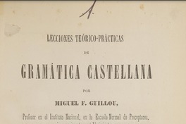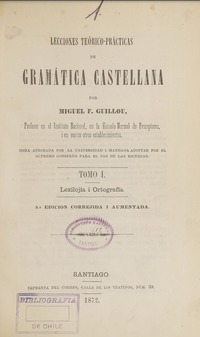 lecciones téorico-prácticas de gramática castellana / M. F. Guillou. Santiago : Imprenta Nacional, 1871. 2 volúmenes ; 18 cm. .