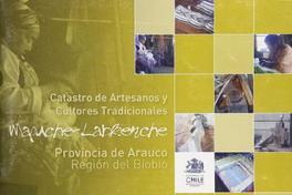 Catastro de artesanos y cultores tradicionales mapuche-labkenche : Provincia de Arauco Región del Bíobio / Gobierno de Chile, Corporación Nacional de Desarrollo Indígena ; [Thiare Manríquez Inostroza, coordinadora proyecto]. [Concepción] : Universidad de Concepción : Gobierno de Chile, Ministerio de Planificación, CONADI, [2010]. 48 páginas : ilustraciones en color, mapa ; 20 x 25 cm. .