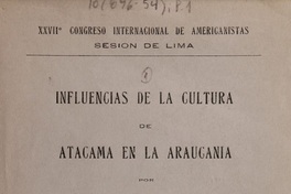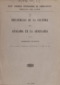 Influencias de la Cultura de Atacama en la Araucania / Aureliano Oyarzún Lima, Perú : Librería e Imprenta Gil, 1941. 13 páginas : ilustraciones ; 24 cm. .