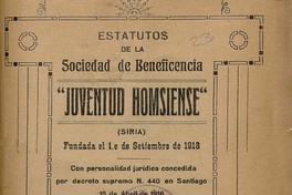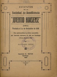 Estatutos de la Sociedad "Juventud Homsiense" : Fundada el 1o. de Setiembre de 1913 / Sociedad "Juventud Homsiense" Santiago : Impr. i Encuadernación "Almurched", [191.?] 15, [15] páginas ; 19 cm. .